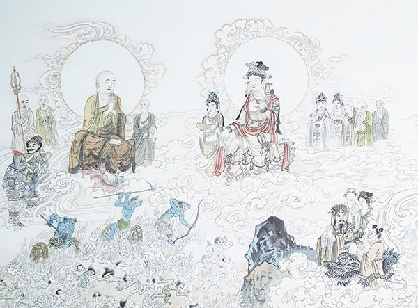 天道化生的阿修羅,是來統持阿修羅界還有諸鬼神界,力動無畏,他的能力洞徹諸天,沒有任何畏懼,可以跟梵王帝釋天還有四天王天爭權,這些阿修羅是化身,是天趣所攝。打仗的時候玉皇大帝未必打得過他,他的受用不如天道,而且脾氣不好,所以常常會來跟帝釋爭權,四天王天會先跟他戰,戰不贏的時候就會求救兵,帝釋再來跟他戰,戰不贏的時候又會求救兵,讓夜摩天還有大梵天王出力助戰,這些阿修羅很強,能夠化身大或者化身小,化身大的時候非常大,能夠以手撼動須彌山,可以使整個的天宮都搖動不安,戰敗的時候他又可以縮小,有個故事講到阿修羅跟帝釋戰鬥輸了,阿修羅就逃到舍衛國的一個蓮花水池裡面,在藕孔中藏匿起來,可以縮到那麼小。最後釋迦牟尼佛要這些天人誦摩訶般若波羅蜜,才打贏阿修羅,這就是正法的力量。以上就是天道的化身阿修羅,他有天福沒天德,屬於天道所攝的阿修羅。