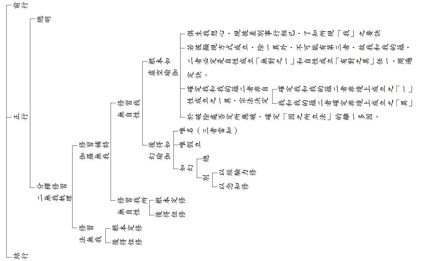六、「無邊識處定」。滅空緣識入無邊識處定,就是連虛空也不想緣念,只緣念自己的心識。四空天本質都是無想,都在追求空靈靈,滅空緣識就是冷冷地觀察自己的心識,使心識不要向外緣,如果心識想往外攀緣,就好像看到小偷出現,小偷因為被他人冷冷地觀察著,會不敢下手偷東西,心識在這樣的觀察下,也就不會去攀緣外境,外境要心識的緣念才會顯現,一切都不緣那就一切都空。爾時他也認為他進入了涅槃,但其實仍有堅固的我執在受用這種空靈的境界,我執絲毫沒有受到影響,還因為妄任證得涅槃,心中產生增上慢。所以不能將無邊識處定的修學法稱為觀心法門,觀心法門是觀察所緣的境界無自體性,貪瞋等心的作用也都是待境而生,所以心也無自體性;雖然都無自性,但進一步觀察當心對境時,又是如何生出種種的現象與作用,此與無邊識處定不一樣。
