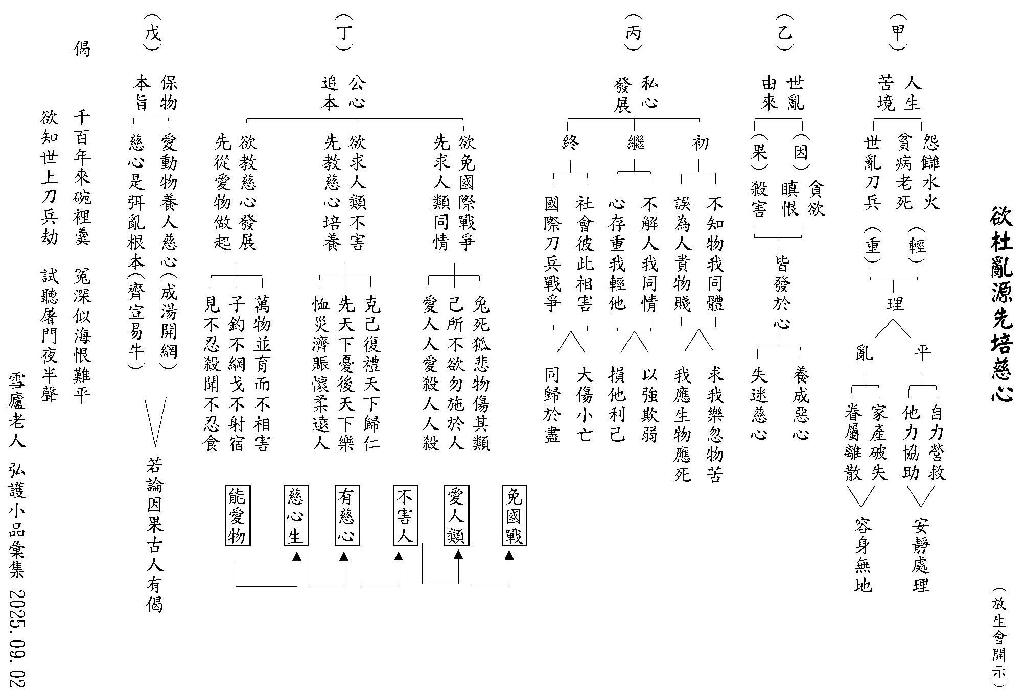 勸廣倡因果,經文:「死生,眾生之大事。因果,教化之大權。願閣下不惜廣長舌,以因果報應為轉煩惱生死,成菩提涅槃之一助。則法門幸甚,眾生幸甚。」輪迴當中死亡之後會有下一期生命現象,關鍵在於是否能在輪迴中看到十二因緣流轉的關鍵在無明,倡導因果教育是改變眾生命運重要的善巧方便。不想受苦者必須要在因上努力做轉變,希望范古農居士能培養人才好好流通正法,將因果輪迴的正知見宣揚,最殊勝的因果觀察就是轉煩惱為菩提,超越生死而達到涅槃,破除二障,看到法無自體性,證得無我,成就佛的智慧。辯才無礙的人才,得到傳承而成為能說者,法門成為所說者,法門成為所證,眾生成為能證,改變命運就從獲得因果的正知見開始。(下期待續)